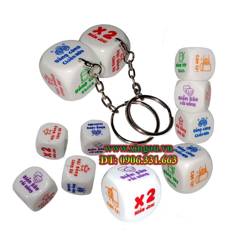 Kích thước sản phẩm 3cm * 3cm vừa tay sử dụng, phần móc khóa có thể tháo lấp rời tiện dụng, bạn có thể vừa làm móc khóa xe hoặc tháo rời móc khóa ra làm xí ngầu lắc uống bịa, tiệc tùng, sự kiện tạo không khí hào hứng, sôi động mà không có gì thay thế được.