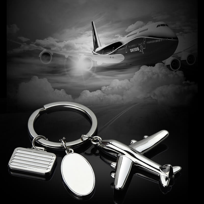 Với chất liệu hợp kim bền bỉ, sáng bóng. Kiểu dáng thiết kế độc đáo, mô phỏng hình ảnh chiếc máy bay có móc kèm chiếc vali xinh xắn rất thích hợp dành cho các hãng hàng không chuyên nghiệp dùng làm quà tặng hành khách trong những chuyến bay. Chiếc móc khóa này còn gắn thêm một miếng kim loại nhỏ để bạn khắc tên, logo hoặc một thông điệp ý nghĩa lên móc khóa bằng công nghệ khắc laser hiện đại. Khắc laser tinh xảo, nhanh và độ chính xác cao, bạn chỉ cần chờ đợi trong vài phút là có ngay một chiếc móc khóa độc - lạ, mang " thương hiệu" của riêng bạn.