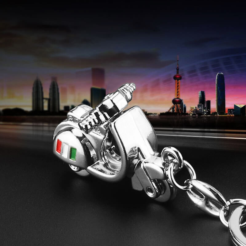 Móc khóa được làm từ chất liệu hợp kim bền bỉ và sáng bóng. Kiểu dáng móc khóa mô phỏng theo hình xe vespa cổ điển, với 2 bánh xe và đầu xe có thể chuyển động.