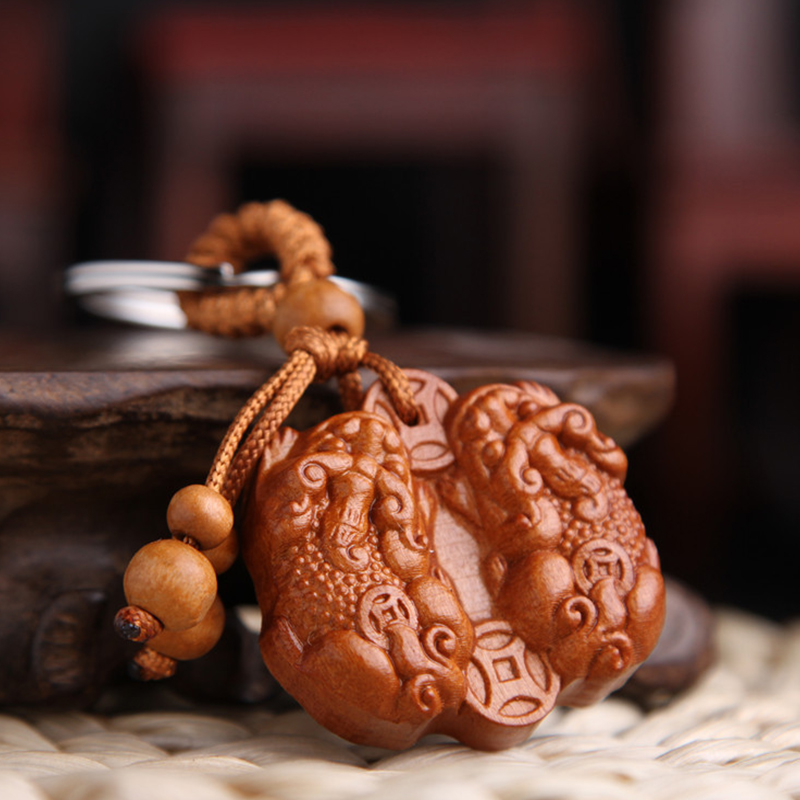 Tỳ Hưu là một loài mãnh thú hung mãnh chuyên cắn hút tinh huyết các loài yêu quái, ma quỷ nên còn được gọi là Tịch Tà. Khi ta đặt Tỳ Hưu được " khai quang'' ở các hướng tốt trong nhà, có tác dụng trấn tà và bảo vệ sức khỏe. Đặc biệt nữa, Tỳ Hưu là linh vật chỉ ăn vàng bạc và không có hậu môn, do đó vàng bạc nó ăn vào no căng bụng mà không bị thoát đi đâu. Tỳ Hưu còn được xem là vật phẩm phong thủy đứng đầu trong việc chiêu tài, giúp gia chủ hút tài lộc và phát đạt trong kinh doanh. Chúng tôi xin giới thiệu đến bạn sản phẩm Móc khóa gỗ cặp tỳ hưu ngậm tiền, từ chất liệu gỗ đào khắc 3D, dùng làm quà tặng ý nghĩa cho những người thân yêu trong các dịp quan trọng.