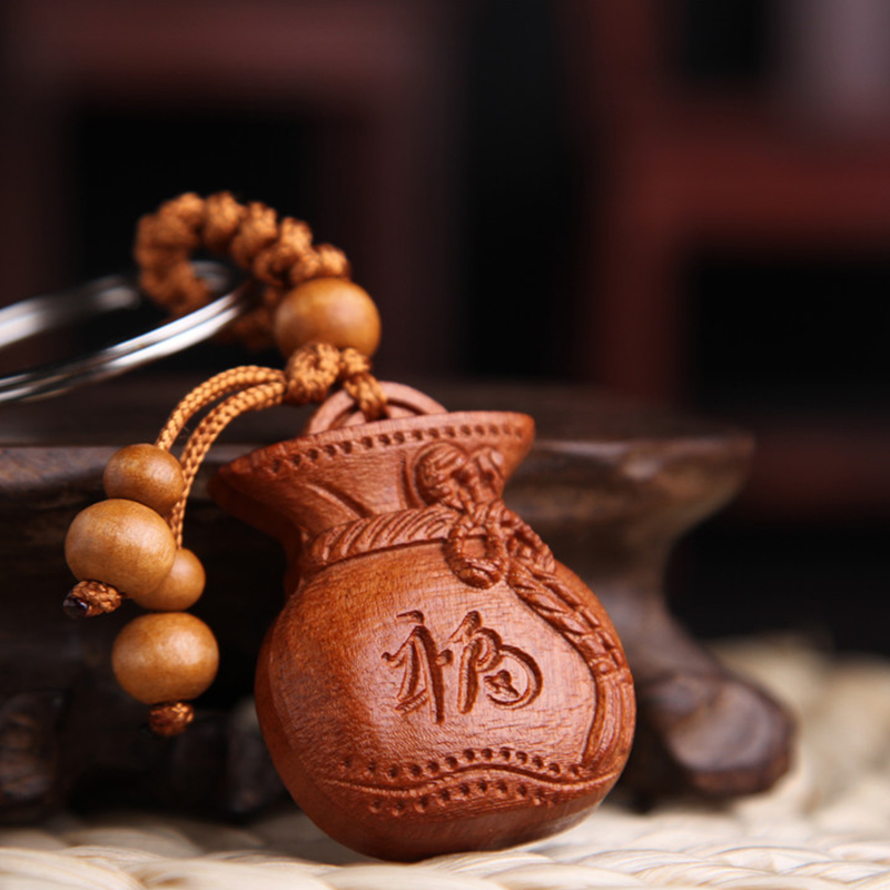 Móc khóa gỗ được chạm khắc rõ nét bằng chất liệu gỗ đào tự nhiên, mô phỏng theo hình chiếc túi đựng tiền vàng nặng trĩu và đong đầy, là biểu tượng cho phước lộc, sự may mắn. Khi mang theo túi tiền vàng bên mình có ngụ ý: thu hút vận may và tăng cường nguồn tài lộc dồi dào. Chúng tôi giới thiệu Móc khóa gỗ hình túi tiền chữ Phúc, có chất liệu từ gỗ đào tự nhiên được điêu khắc 3D tinh xảo, dùng làm quà tặng ý nghĩa cho những người thân yêu trong các dịp quan trọng.