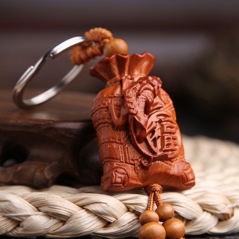 Tên sản phẩm: Móc khóa túi tiền khắc chữ phúc bằng gỗ